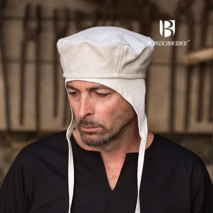Chapeaux comme celui-ci ont été portés pendant le haut et fin du Moyen Age. Il existe plusieurs représentations d’entre eux dans les manuscrits. Ils peuvent très bien être combinés avec le bouchon Bertram.