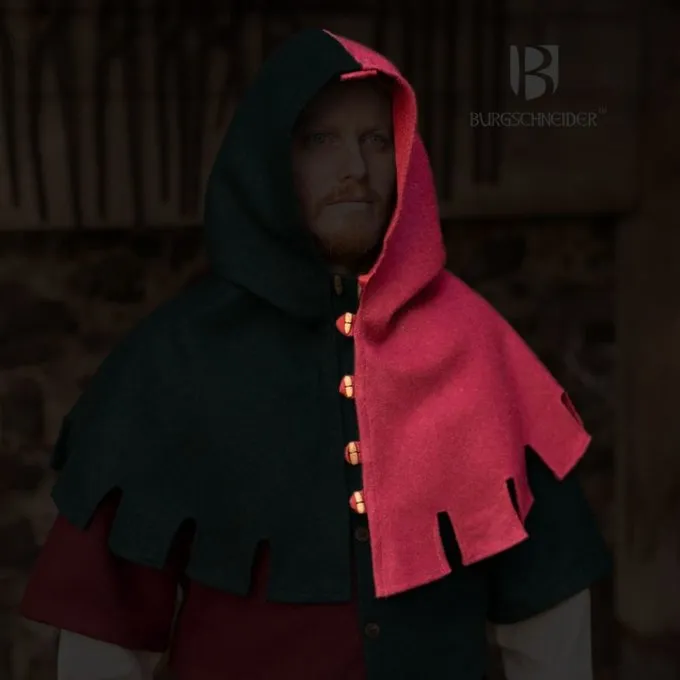 Découvrez la nouvelle collection Mi Parti de Burgschneider! Le chaperon dangereuse se compose de deux moitiés vendues séparément. De cette façon, vous pouvez assembler un Hood MI Parti à vos souhaits. Fixez le côté gauche vers le côté droit avec les boutons. Si vous êtes dans différents groupes médiévaux et de reconstitution médiévaux, vous pouvez faire beaucoup de combinaisons de couleurs différentes avec quelques côtés gauche et droit. Le capot est un vêtement porté dans l’Europe médiévale entre les XIIe et 14e siècles. À l’origine, les agriculteurs le portaient principalement contre le froid et la pluie, mais plus tard, il est devenu un vêtements de mode et il a pris des formes spéciales. Le chaperon « dangereuse » est composé d’un tissu en laine épais avec une couleur profonde, adaptée à toutes les conditions météorologiques. Du 11e au XVIe siècle, le style de robe « Mi-parti » (partiellement coloré) était populaire, reliant deux tissus de couleur différents au milieu. L’effet est un contraste de couleur qui crée souvent un aspect dramatique. Au Moyen Âge, MI-Parti était un style important parmi les capes, les tabards, les robes, les pantalons et les robes. Les premiers exemples de ce style remontent aux 9e et au 10e siècle, où les couleurs divisées ont été utilisées sur les jambes et les chaussures. Par exemple, les bottes étaient une demi-couleur et la moitié de l’autre couleur. Dans le moyen moyen-âge, le style Mi Parti a gagné en popularité à mesure que le symbolisme de couleur dans les vêtements est devenu plus important. Les couleurs représentaient souvent un certain statut ou une certaine connexion. Le style est devenu plus courant aux XIIIe et 14e siècles lorsque de nombreux hommes, en particulier des vassaux, ont imité les armoiries de leurs seigneurs féodaux. Vers la fin du XVIe siècle, le style a progressivement diminué.