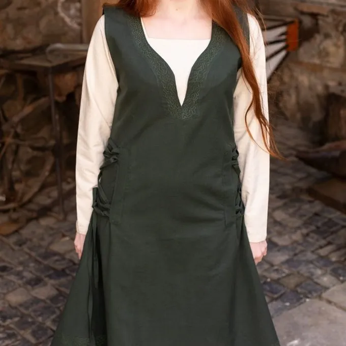 Cette robe peut être portée par-dessus une simple robe pour créer un look spécial. Son encolure est remarquable et son motif symétrique brodé autour du cou et au bas de la jupe. Des lacets à serrer sur les côtés de la robe pour un modèle ajusté. Un complément parfait à une tenue de LARP, de Cosplay ou de festival.