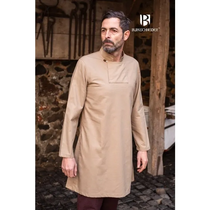 Cette tunique est basée sur des fragments de vêtements découverts à Skjoldehamm, en Norvège et à Kragelund, au Danemark. Il est en coton et peut être porté séparément ou sous un autre vêtement les jours les plus froids. Le col carré distinctif, typique de ces fragments excavés, peut être fixé avec un bouton.
