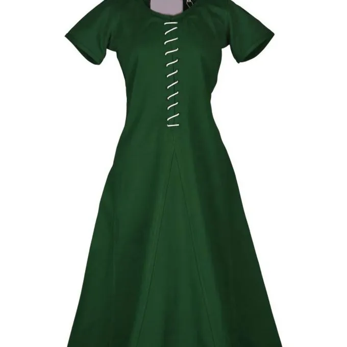 Cette belle cotehardie est faite d’un tissu de coton robuste et de manches courtes, parfaite pour les mois les plus chauds. Dans la jupe, selon des exemples historiques, des bandes de textile en forme de coin ont été utilisées pour élargir la jupe.