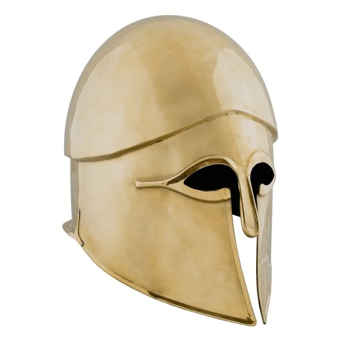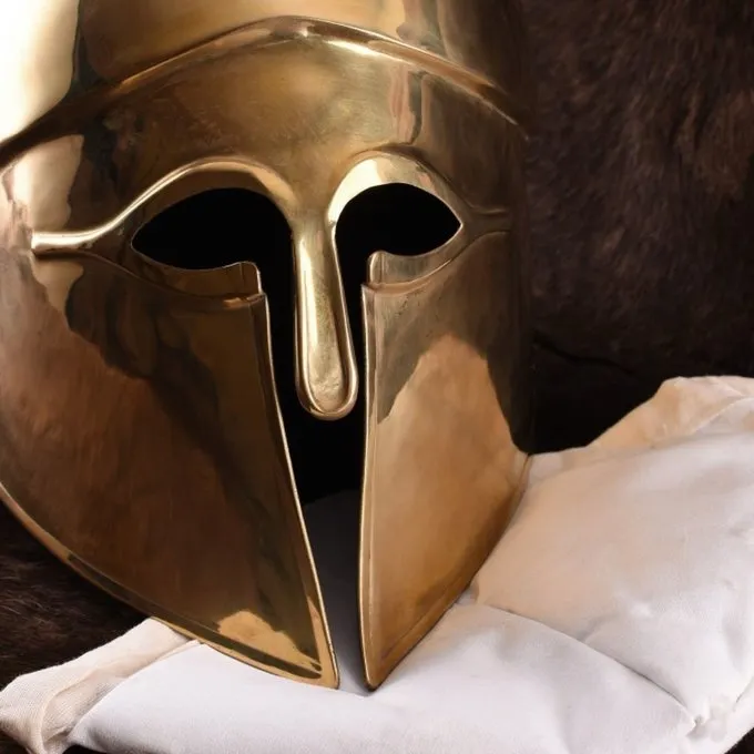 Ce casque est une réplique du casque corinthien comme il a été porté par les spartiates hoplites autour du sixième-cinquième siècle avant notre ère. Le nom de ce type de casque est dérivé de la ville grecque de Corinthe. Le casque corinthien était utilisé à partir du VIIe siècle avant notre ère. mais autour du cinquième siècle, il a atteint la forme que nous connaissons aujourd’hui. Les caractéristiques de ce casque sont la pièce de nez, la fente pour les yeux, la fente étroite à l’embouchure, la protection supplémentaire d’épaisseur du crâne à la forme des sourcils ronds et le protège-cou en saillie. Cette réplique est en laiton et est livré avec une épaisse calotte pour porter le confort supplémentaire. Un casque parfait pour la reconstitution grecque et LARP et cosplay de personnages de l’Antiquité.