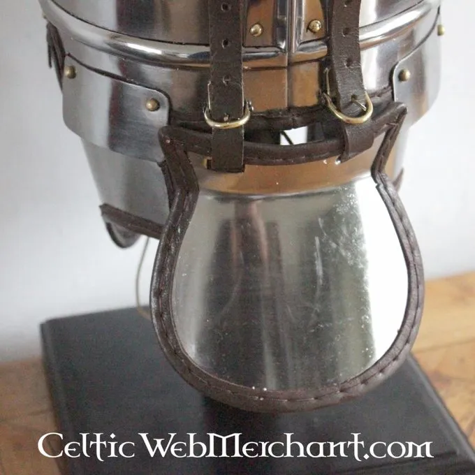 Cette réplique en acier est faite d’après un original du chteau de Burgh, Norfolk, Angleterre de la 3ème-4ème siècle après JC. Les types de casques romains plus tard weren? T sur la base de conceptions celtiques plus, mais sans doute sur les casques de l’Empire perse, qui a été le jour dans cette période. Autour du 2ème siècle après JC la cavalerie était devenu une partie essentielle de l’armée romaine, bien qu’elle soit restée une unité vulnérables, cinquième de l’armée composée de cavalerie.
