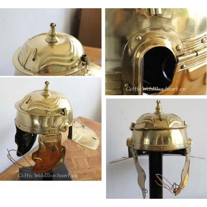 Ce est une réplique d’un casque trouvé à Mayence (Allemagne). Casques de ce genre ont été portés dans tout l’empire romain autour du 2ème siècle de notre ère.
