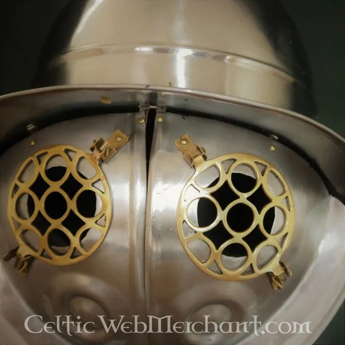 Ce casque de gladiateur est une réplique d’un original à partir du 1er siècle après JC fouillé à Pompéi. Le casque est réalisé en acier au carbone ayant une épaisseur d’acier de 1,2 mm. Le Thraex est fréquemment représenté sur la poterie, du verre et des fresques.
