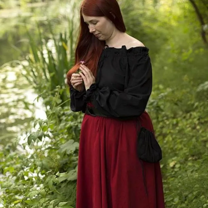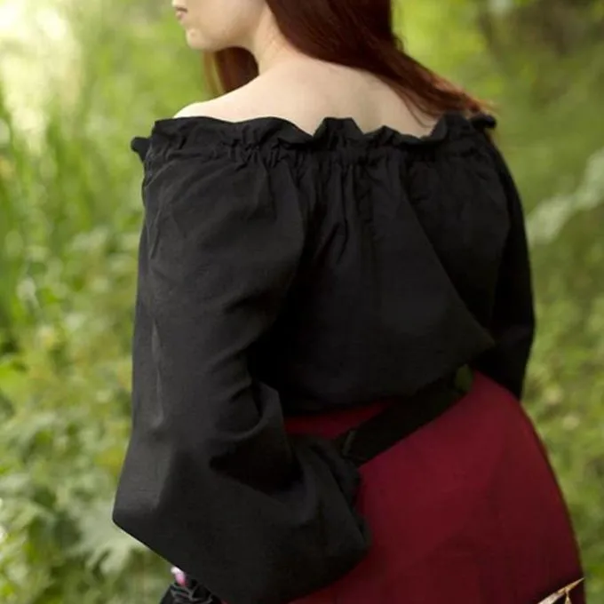 Ce chemisier pirate s’inspire des modes typiques de la Renaissance tardive et du début du baroque. La blouse a des manches larges, soulignées par le volant au poignet que vous pouvez fermer pour que les manches ne vous gênent pas. Le haut de la blouse est réglable, il peut être porté épaules ouvertes ou comme une blouse normale aux épaules couvertes.