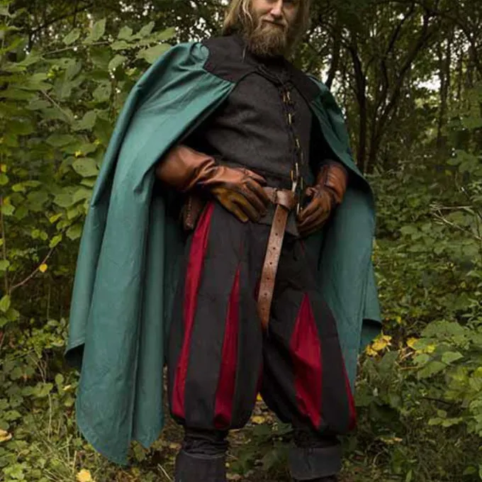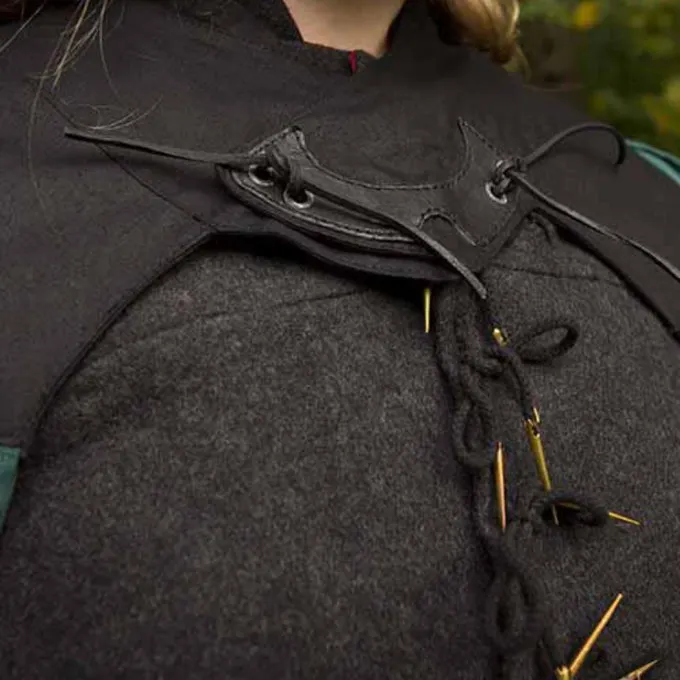 Cette cape atteint environ les genoux et peut être fixé autour du cou avec un cordon en cuir. Le manteau a un front ouvert et laisse les mains libres pendant les batailles. A l’arrière du manteau a un bel effet symétrique: au milieu, il est plus court que sur les côtés. Le col contrasté sur le dessus avec sa décoration en cuir est aussi un point de mire. Un grand manteau confortable pour tous vos personnages et LARP cosplay.