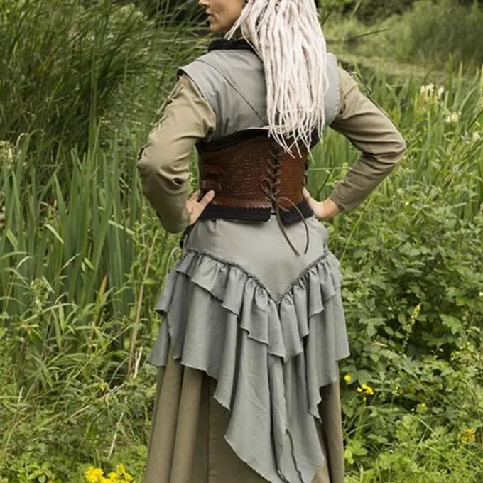 Avec ce magnifique corset en cuir, vous pouvez créer les plus belles tenues LARP, Cosplay et steampunk. Ce corset se porte sous les seins et est fabriqué en cuir de vachette robuste et durable. Le corset est complètement décoré avec un motif en relief élaboré. Le bord extérieur du corset a un motif symétrique et est garni de velours noir. Avec les lacets en cuir à l’avant et les boucles sur les côtés, le corset peut être ajusté à votre taille.