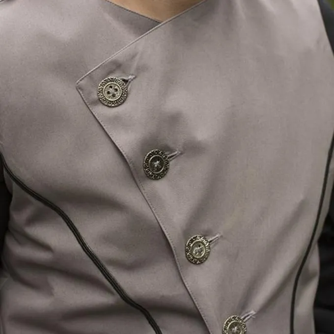 Ce superbe gilet asymétrique est parfait pour la reconstitution du XIXe siècle, le GN et le steampunk. Confectionnée dans un style victorien, elle se combine facilement avec une chemise ou une robe pour donner à votre tenue une allure supplémentaire. Le sommet a une rangée de quatre boutons. Vous pouvez choisir de fermer tous les boutons ou d’ouvrir le col. Le col est doublé de satin gris. Une fois ouvert, la couleur grise apparaîtra. Le dos a également une doublure en satin gris. Ce gilet met l’accent sur la taille et court jusqu’aux genoux. Le devant est plus long que le dos, ce qui donne un effet asymétrique fascinant et magnifique.