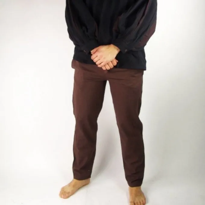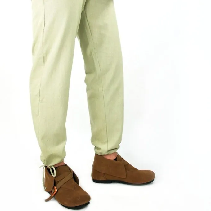 Ces pantalons sont faits de coton robuste. Ils ont une ceinture élastique et des cordes à la fin de la jambe. Ils ont deux poches. Les pantalons sont disponibles en noir, marron, naturel et sable.
