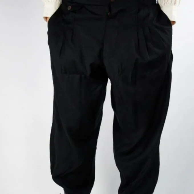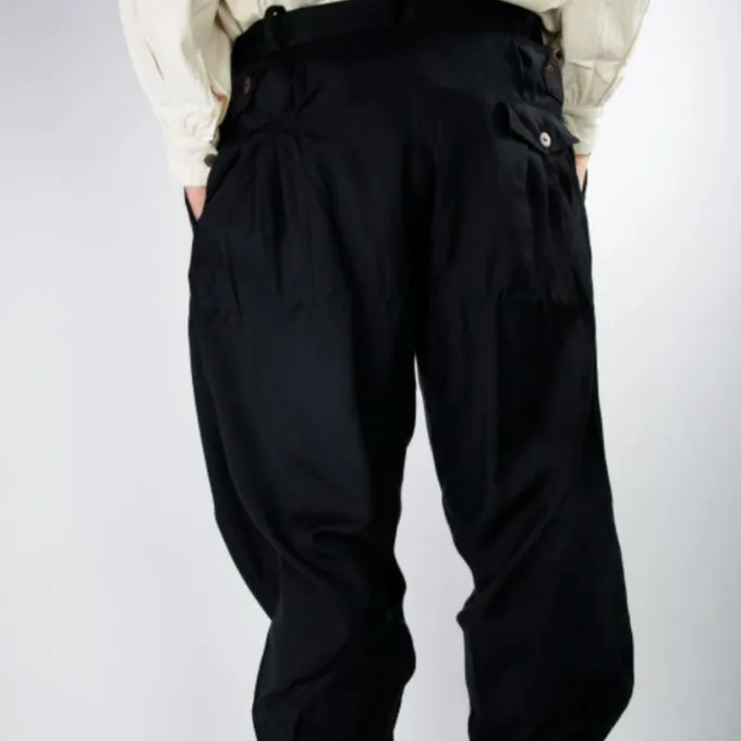 Ces pantalons sont faits de coton noir. Au niveau des chevilles, ils ont des boutons pour la fermeture.