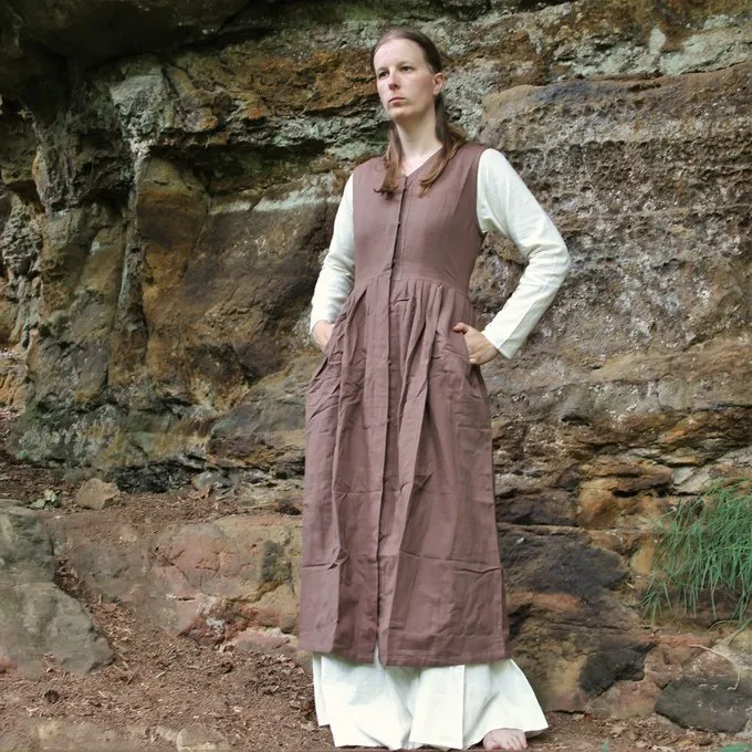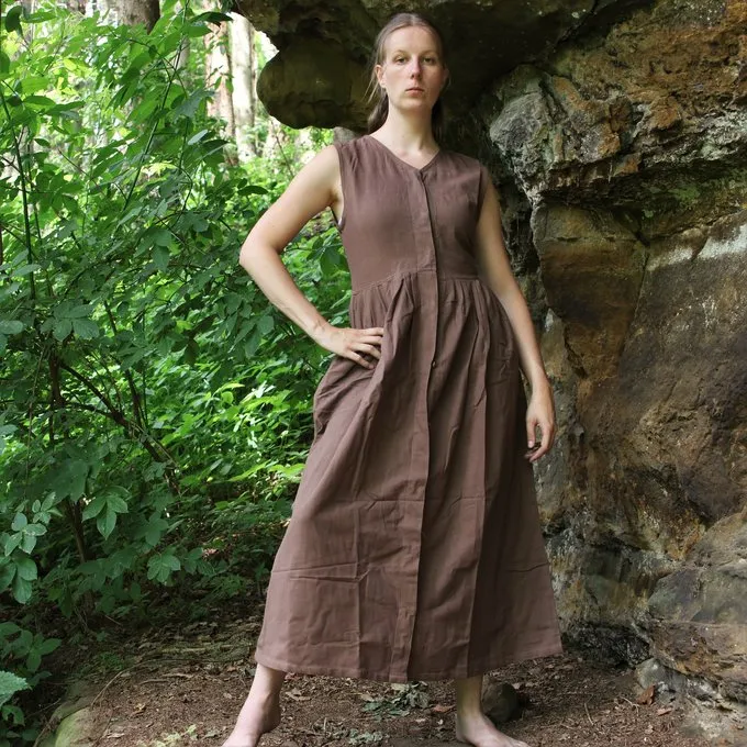 Cette robe sans manches est faite de coton et peut être fermée avec des boutons en bois.