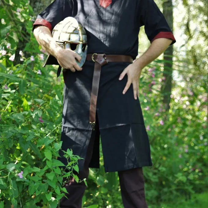 Ce type de tunique était un vêtement de base porté par des hommes de toute l’Europe pendant le début du Moyen Age tardif. La tunique peut être portée seule, ou sous le sous-vêtement sous une tunique d’une autre couleur. Dans les climats plus froids, il était souvent combiné avec des pantalons et des enveloppes pour les jambes.
