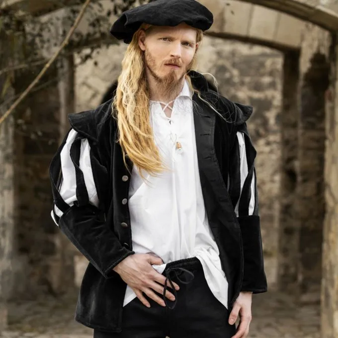 Cette veste est faite de velours et a des manches ouvertes. Il est doublé et n’a pas de tissu entre les ouvertures des manches. Les manches peuvent être fermées avec des cordons et l’avant peut être fermé avec des boutons.
